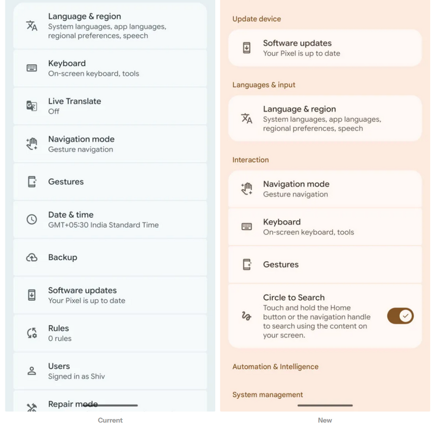 В новой сборке также замечены небольшие изменения в интерфейсе. Например, значок регулировки яркости стал более округлым. Меню настроек системы теперь разделено на более чёткие категории. Кроме того, функцию Circle to Search теперь можно включить напрямую в настройках системы, без необходимости искать её в дополнительных разделах.