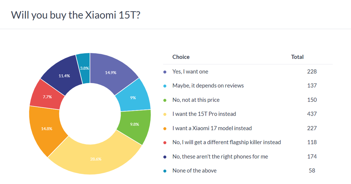 Результаты показали, что пользователи значительно чаще выбирают Xiaomi 15T Pro, чем стандартную модель. Так, около 40% респондентов заявили, что готовы купить 15T Pro, ещё 13% сочли его слишком дорогим, а 16% планируют дождаться Xiaomi 17.