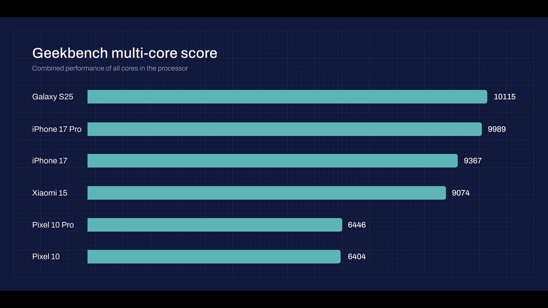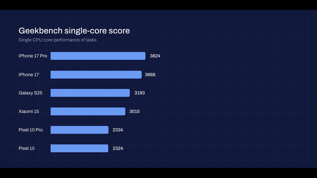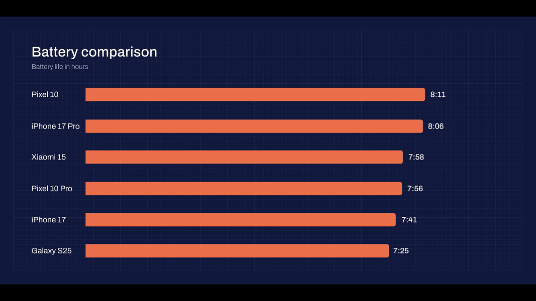 Ёмкость аккумулятора у Pixel 10 - 4970 мАч, у iPhone 17 - 3692 мАч. При этом разница во времени работы экрана между ними составила менее часа: 7 часов 41 минута у iPhone и 8 часов 11 минут у Pixel. Что касается производительности, то iPhone здесь лидировал.