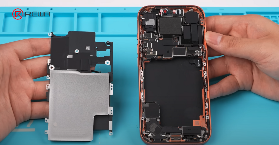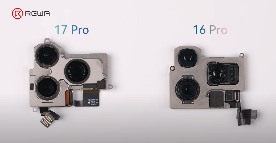 Сначала снимается экран, затем защитная пластина с батареей. Материнская плата iPhone 17 Pro содержит множество разъёмов, поэтому её снятие требует осторожности. Модуль задних камер стал заметно больше, чем у предыдущей модели, а фронтальная камера получила более крупные сенсоры. При этом сама плата уменьшилась и компоненты на ней расположены плотнее.