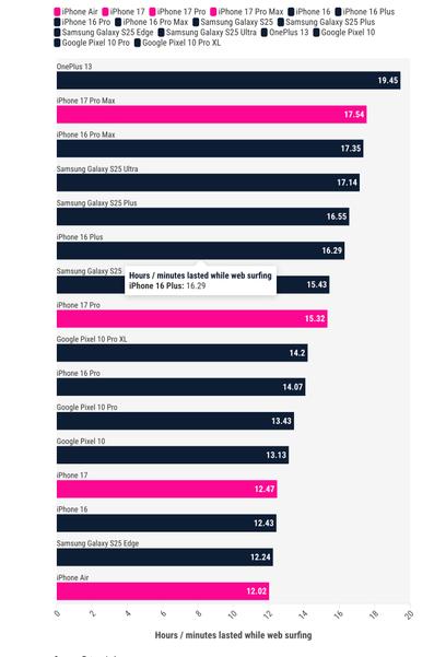 Тестирование заключалось в непрерывном просмотре веб-страниц через связь 5G с яркостью экрана 150 нит. iPhone 17 Pro Max работал без подзарядки 17 часов 54 минуты, что является наиболее длительным временем автономности, iPhone 17 Pro работал в течение 15 часов 32 минут, а младшая модель, iPhone 17, — 12 часов 47 минут. У iPhone Air оказалось самое короткое время автономной работы — 12 часов 2 минуты.