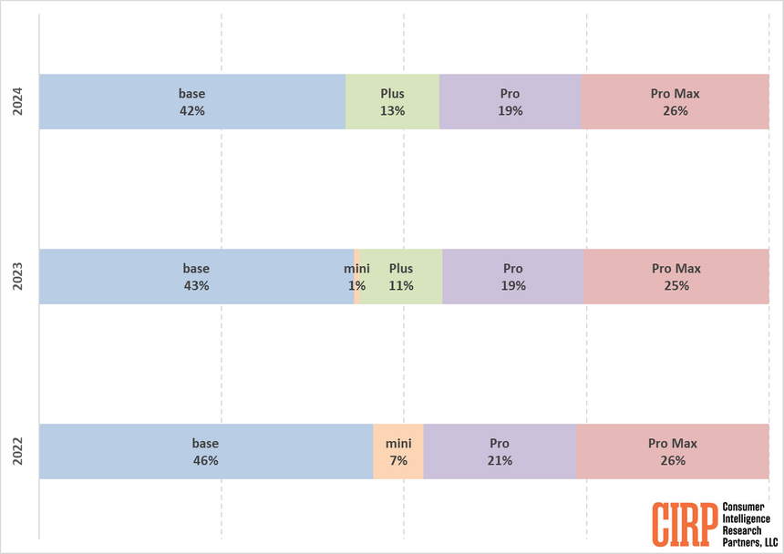 По словам аналитиков, хотя Pro-версии айфонов последних линеек нередко и возглавляют рейтинги продаж, это, как правило, данные за короткие периоды времени. На деле базовые модели продаются лучше: за последнее время доля базовых версий разных линеек iPhone составляет 53%, флагманов — 47%.