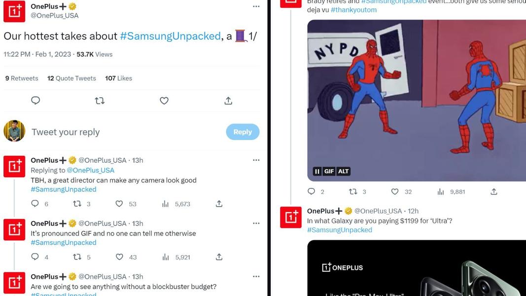 Не забыв прорекламировать свои смартфоныВ то время как мероприятие Samsung (на котором были представлены флагманы серии Galaxy S23) транслировалось по всему миру, OnePlus публиковал сообщения в Twitter, где недвусмысленно троллил компанию из Южной Кореи. Как минимум за цены флагманов Samsung.