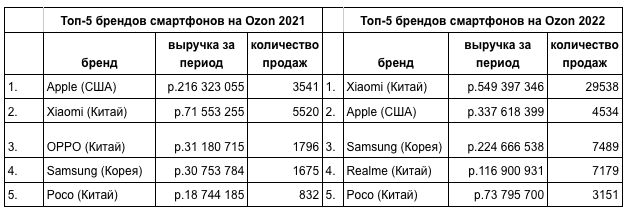 При этом общее число продаж смартфонов выросло, но в основном за счёт смартфонов из Азии. На Wildberries в июне 2022 года количество продаж выросло в два раза. Лидером был бренд Xiaomi. На Ozon в июне 2022 года общие продажи смартфонов выросли. Что касается популярных брендов, то на первом месте оказался Xiaomi с выручкой 550 млн, что почти в 8 раз больше, чем в прошлом году. На втором месте была Apple с выручкой 337 млн.