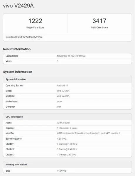 Скорее всего, это Snapdragon 7 Gen 3Как пишут инсайдеры из Gizmochina, речь идёт о версии в ванильном цвете. Vivo S20 под номером V2429A получил 1222 и 3417 баллов в одноядерном и многоядерном тестах соответственно.