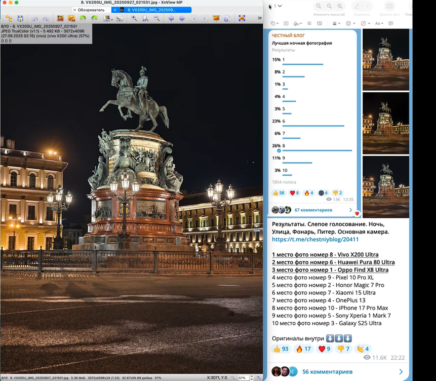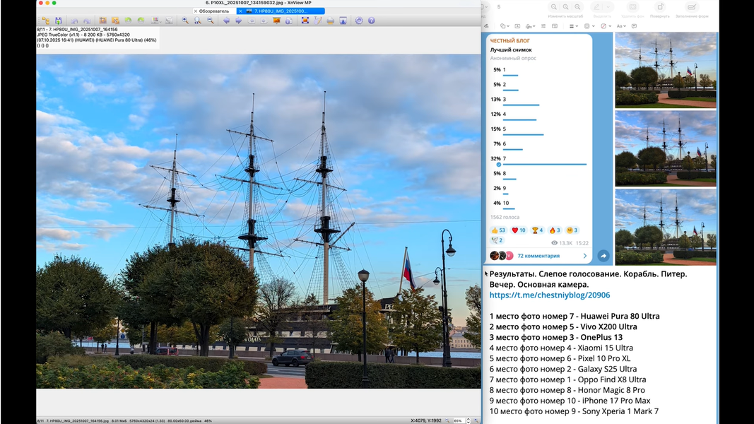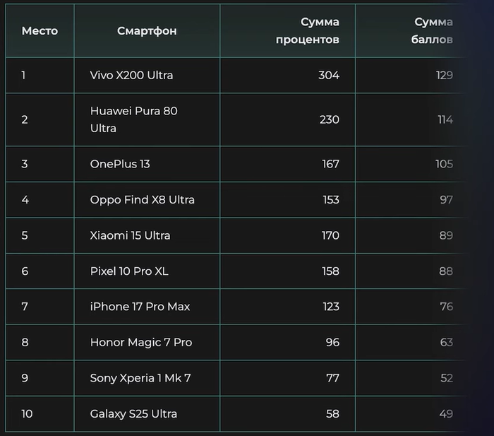 И Vivo победил с большим отрывомВ слепом голосовании в Telegram-канале участвовало 10 моделей смартфонов. Это Samsung Galaxy S25 Ultra, Sony Xperia 1 Mk 7, Honor Magic 7 Pro, iPhone 17 Pro Max, Pixel 10 Pro XL, Xiaomi 15 Ultra, Oppo Find X8 Ultra, OnePlus 13, Huawei Pura 80 Ultra, Vivo X200 Ultra.