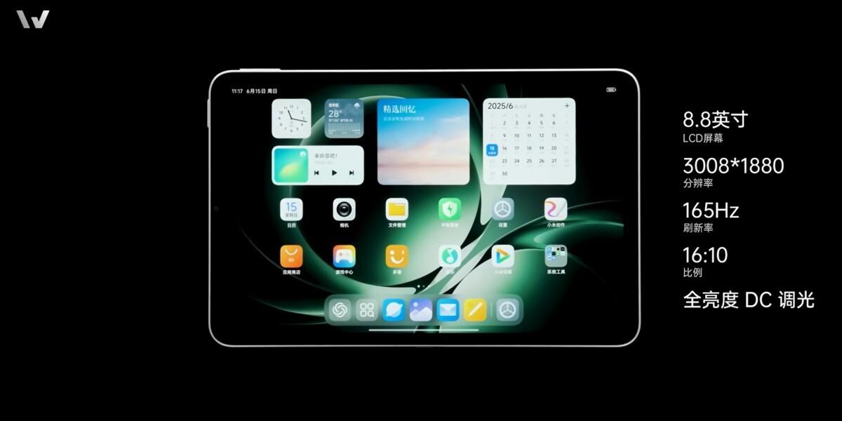 Redmi K Pad получил экран 8,8 дюйма с IPS LCD, поддержкой Dolby Vision и частотой обновления 165 Гц. Разрешение — 3008×1880 пикселей, яркость достигает 610 нит в режиме повышенной яркости. Планшет выполнен из металла с приятным матовым покрытием, весит всего 336 грамм и очень тонкий — 6,46 мм.