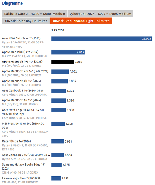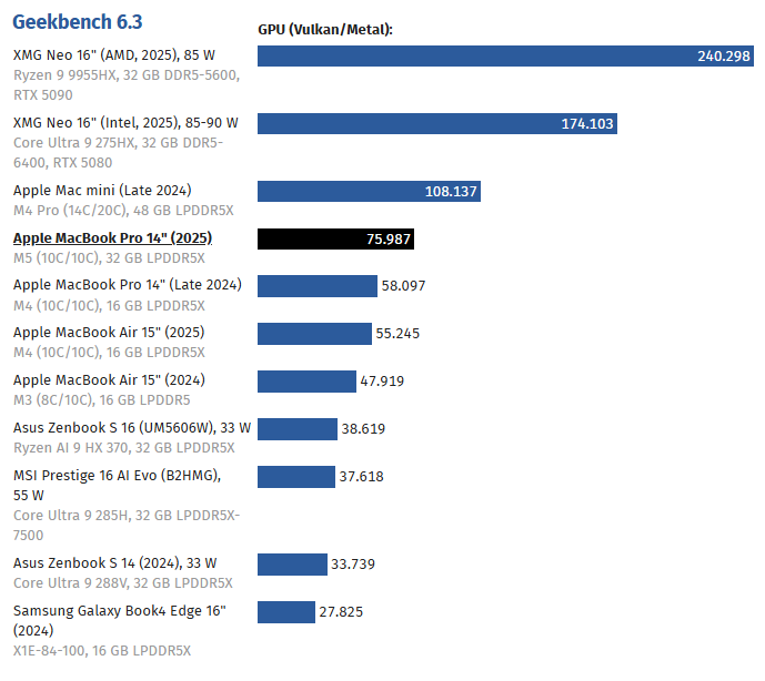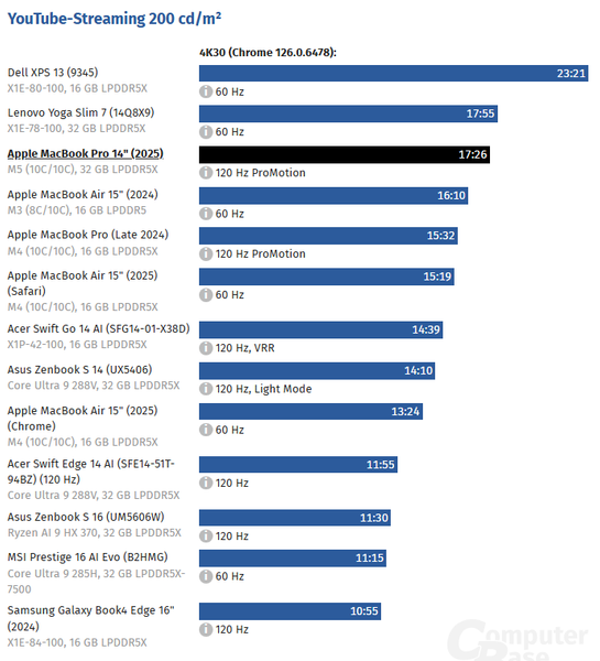 Редакция ComputerBase отметила, что MacBook Pro M5 сочетает рекордную производительность, автономность и качество дисплея, сохранив фирменный дизайн и компактность, назвав его лучшим ноутбуком для профессионалов в 2025 году.