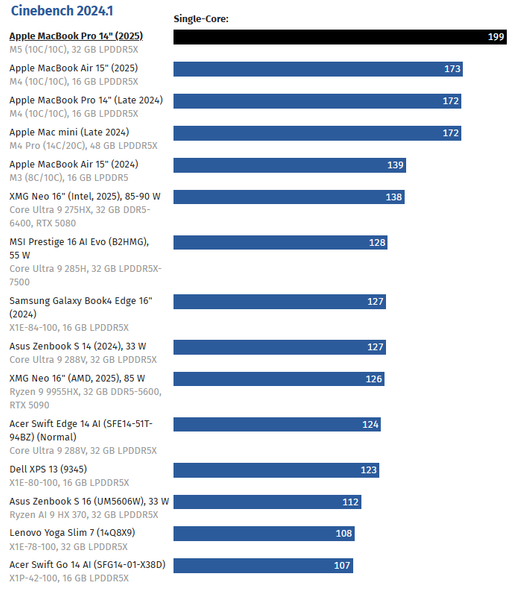 «Лучший ноутбук для профессионалов в 2025 году»По результатам тестов, M5 набрал 199 баллов в Cinebench 2024, обойдя даже настольные Intel Core Ultra 9 285K (149) и AMD Ryzen 9 9950X3D (140). В Geekbench 6 чип показал 4325 баллов, что на 13% выше, чем у M4 Pro.