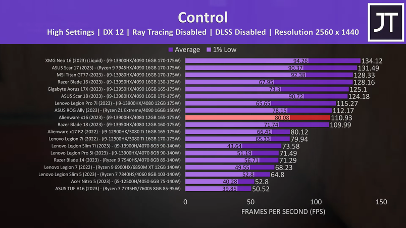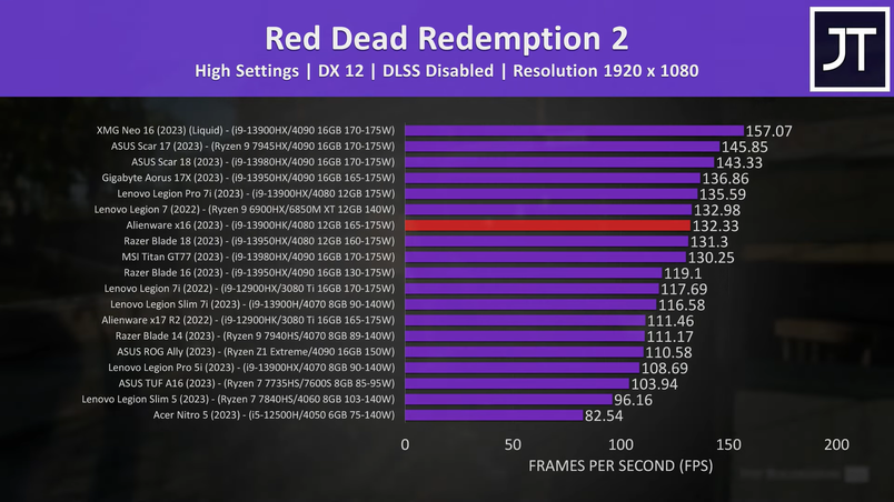 Что касается игр, то Dell Alienware x16 протестировали в трёх проектах в 1080p, 1440p и 4К. Это Cyberpunk 2077, Red Dead Redemption 2 и Control. В игре Cyberpunk 2077 новинка немного отстаёт от других моделей ноутбуков на RTX 4080, но эти ноутбуки и работают на более мощных процессорах. С результатами тестирования вы можете подробнее ознакомиться ниже.