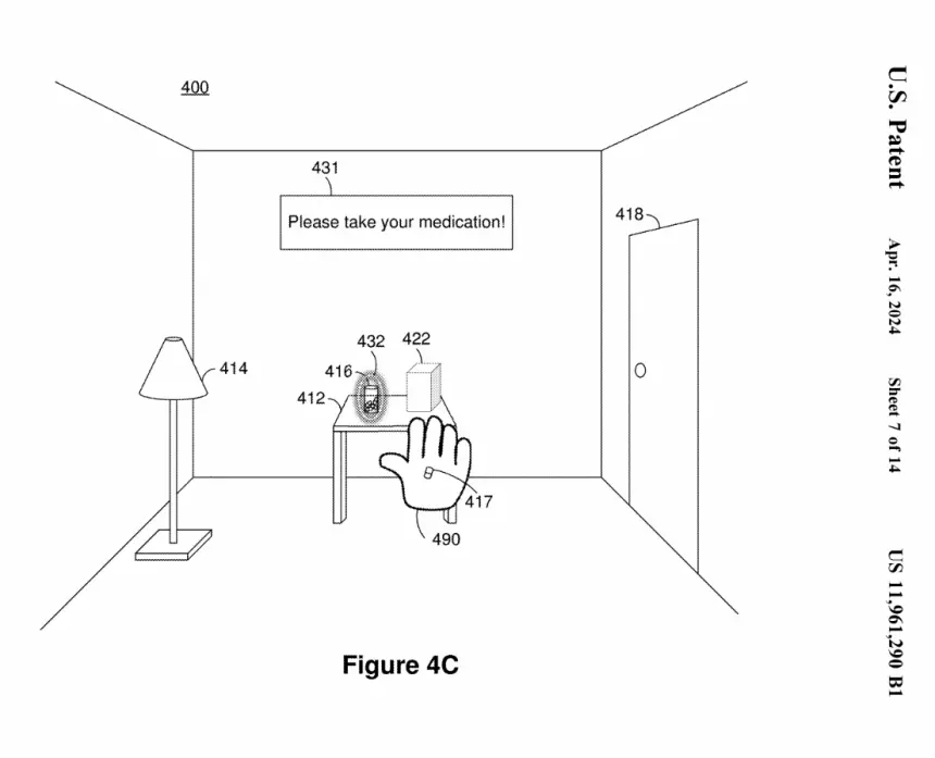 В патенте описан пример, когда гарнитура обнаруживает, что пользователь забыл принять лекарство. В этом случае она может вывести напоминание и даже помочь найти лекарственный флакон.