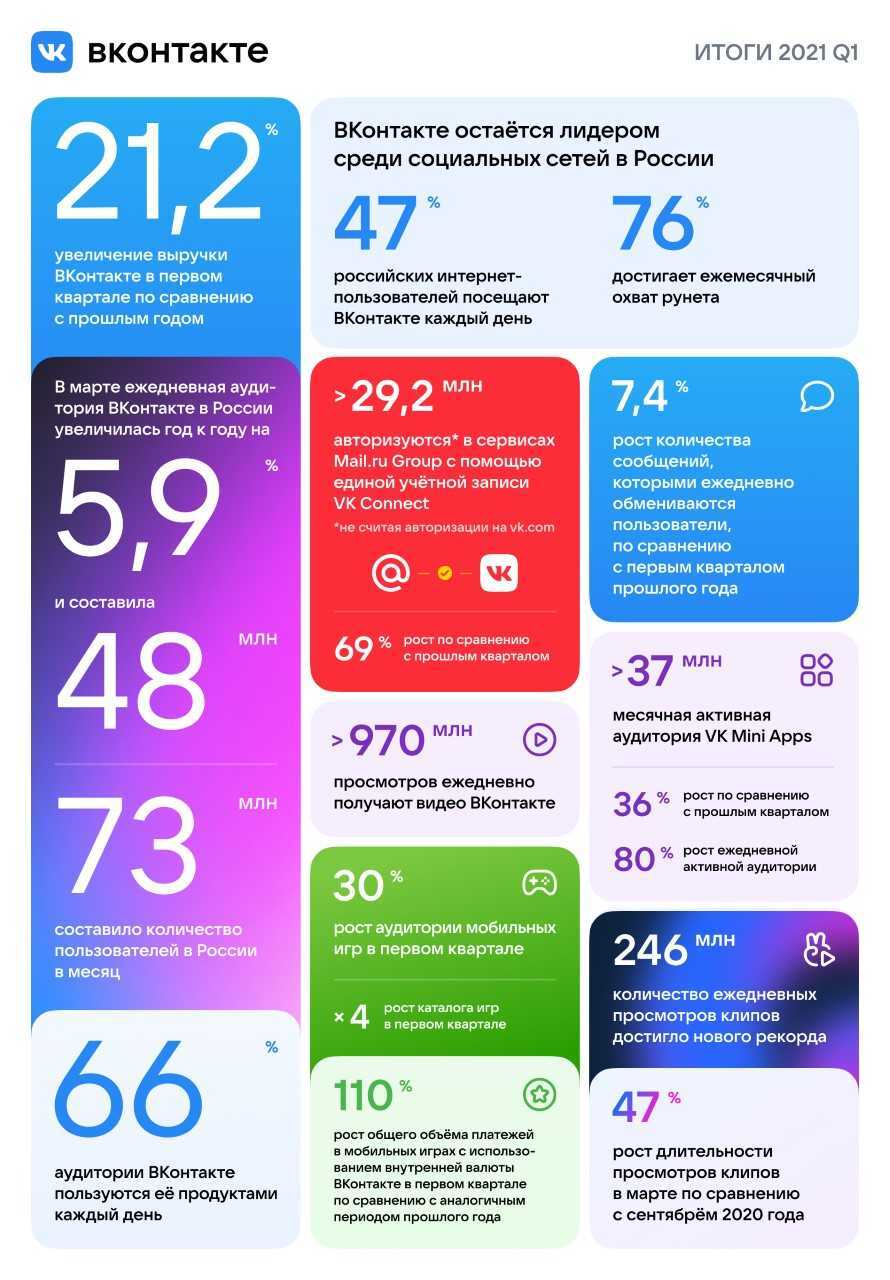 Пресс-служба «ВКонтакте» сообщает, что выручка компании выросла на 21,2% по сравнению с тем же периодом 2020 года. Ежедневная аудитория тоже увеличилась — на 5,9% год к году. Равна 48 млн. Ежемесячное число пользователей соцсети в России составляет 73 млн. «ВКонтакте» утверждает, что соцсеть каждый день посещают почти половина — 47% — российских интернет-пользователей.