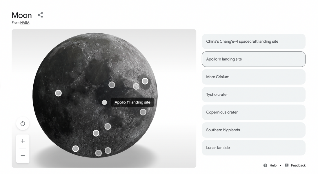 По словам представителей поискового гиганта, при просмотре 3D-модели планеты или Луны, в Google Поиске вас будут встречать маркеры знаковых моментов и известных достопримечательностей, таких, например, как место посадки «Аполлона-11» и китайского аппарата «Чанъэ-4».