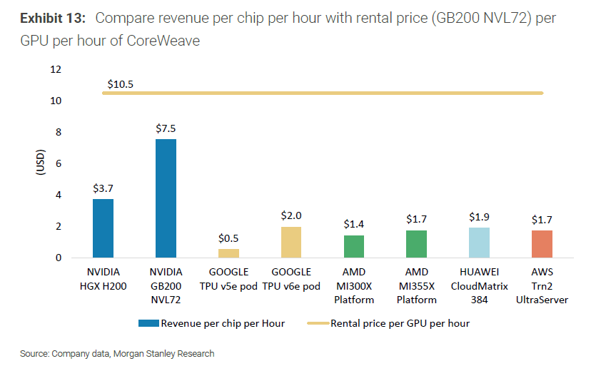 Следующий год обещает быть еще интереснееНовая платформа GB200 NVL72 демонстрирует маржинальность почти 78% и приносит свыше $3,5 млрд прибыли, что значительно выше конкурентов. Для сравнения, Google TPU v6e достигает 74,9%, AWS Trn2 Ultra — около 62,5%.