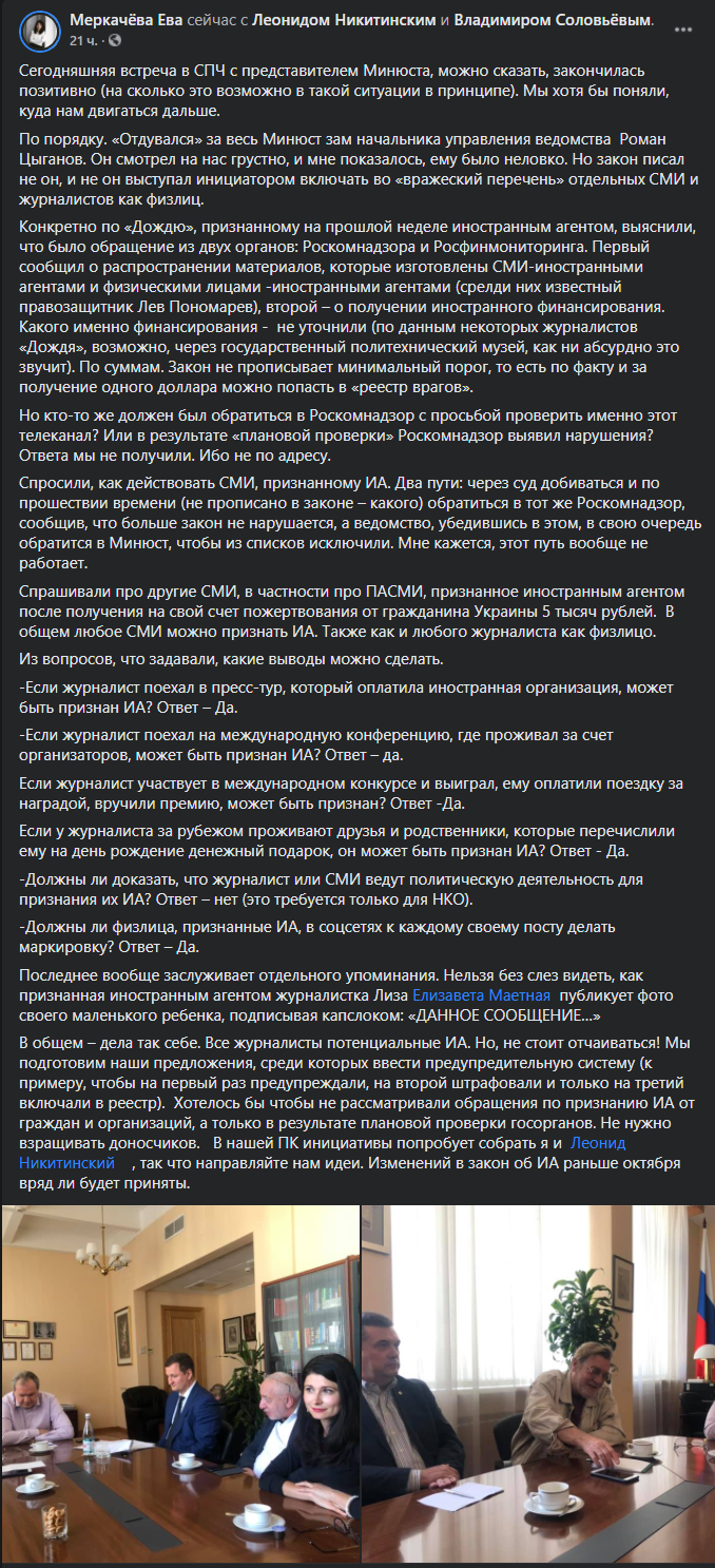 Чтобы вдруг стать иноагентом, необязательно вести политическую деятельностьМеркачёва сделала выводы, что любое СМИ и любого журналиста могут признать иностранным агентом. Это распространяется и на тех представителей СМИ, которые ездят в пресс-туры, оплачиваемые иностранными организациями, или на международные конференции, где проживают за счёт организаторов. Кроме того, не обязательно доказывать, что журналист ведёт политическую деятельность для признания его иностранным агентом.