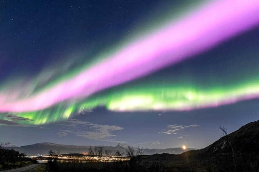 Наблюдалось в НорвегииТуристы увидели на севере Норвегии розовые полярные сияния. Такой цвет они приобретают, когда потоки заряженных частиц проникают очень глубоко в земную атмосферу.