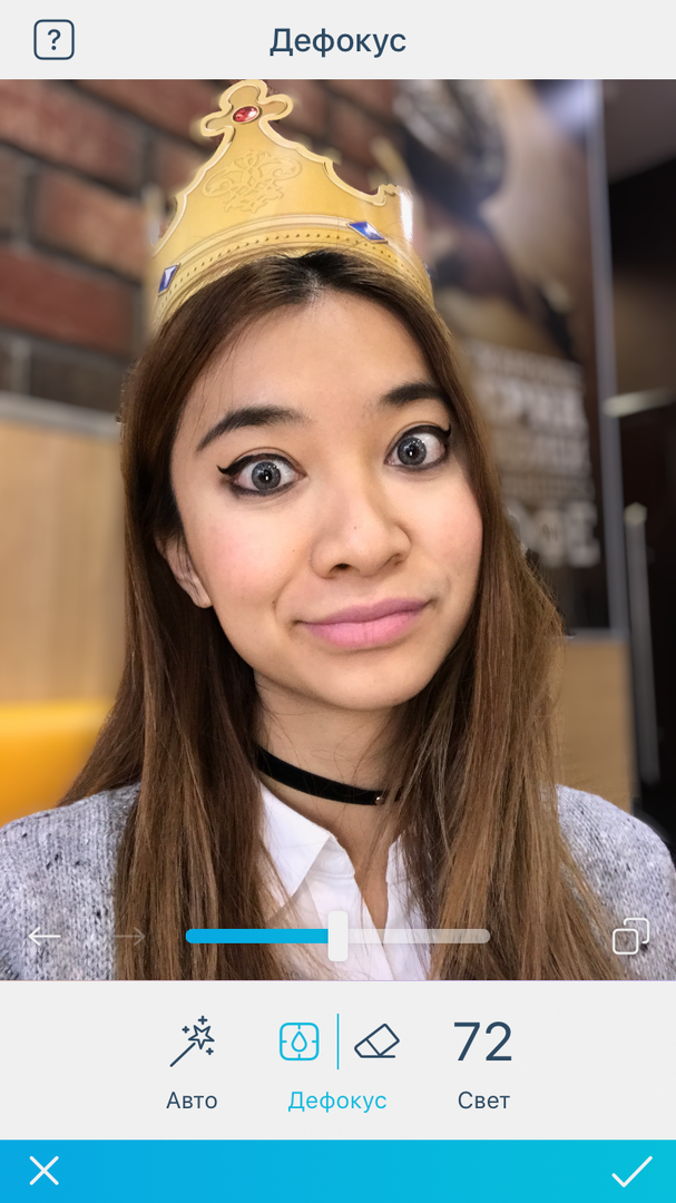 Громадный селфи-комбайн с миллионом фич для выправления каждого недостатка особенности на лице. Сама программа бесплатная, но большинство фильтров и эффектов доступны только покупателям VIP-подписки (129 рублей в месяц, 2290 рублей навечно). Facetune умеет менять форму лица (сужать подбородок, расширять улыбку), разглаживать кожу, убирать морщины, отбеливать зубы и глаза, добавлять блики. Есть отдельный инструмент для размытия фона — если у вас не iPhone 7 Plus или Huawei P9 и подобные, то всё равно сможете сделать красивое боке (автоматический режим работает не очень аккуратно, придётся поработать пальцем).
