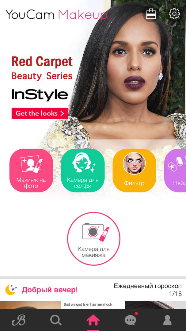 Разработчики YouCam зачем-то разделили своё приложение на два. Первое — YouCam Perfect — умеет прихорашивать лицо, улучшать форму, делать кожу такой, какую мы видим в журналах. А вот особенную фичу вынесли в программу-сателлит — YouCam Makeup. Это настоящий гримёр в телефоне. Makeup красит волосы, аккуратно наносит помаду на губы, подводит глаза, меняет цвет бровей. Есть и набор готовых образов, например, можно накраситься в стиле 40-х: длинные ресницы, румяна и очень яркая красная помада. Хороший способ «примерить» макияж.