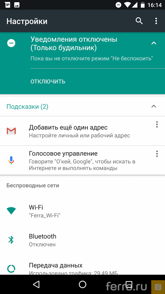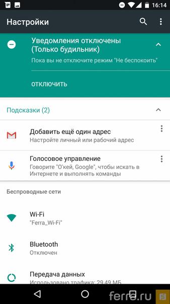 Wi-Fi докладывает, к какой точке доступа вы подключены, «передача данных» рапортует о количестве израсходованного трафика, экран докладывает об уровне подсветки, и так далее. Выглядит очень живо. При этом в самом верху меню есть подсказки по настройке для тех, кто хотел «чего-нибудь покрутить» в установках смартфона, но не определился, что именно.