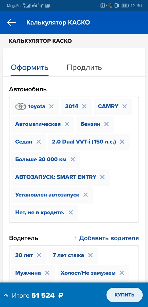 После этого заполняем основные данные о себе (семейное положение, дети, водительский стаж) и автомобиле (марка, модель, двигатель, тип сигнализации, пробег). Никакого ручного ввода, только готовые варианты ответов. База данных настолько большая, что в ней уже есть все комплектации автомобиля, нужно только выбрать необходимую и обозначить пробег. Это очень экономит время.