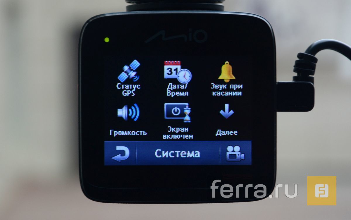Кнопок управления у регистратора нет, лишь одна единственная кнопка для включения и выключения гаджета. Впрочем, это и неудивительно, ведь всё управление отдано на откуп сенсорному экрану. Рядом с кнопкой включения есть слот для карточки microSD, которую, напомним, придётся купить отдельно. Устройство поддерживает карточки до 32 ГБ, а компания Mio также рекомендует использовать класс не ниже 6-го.