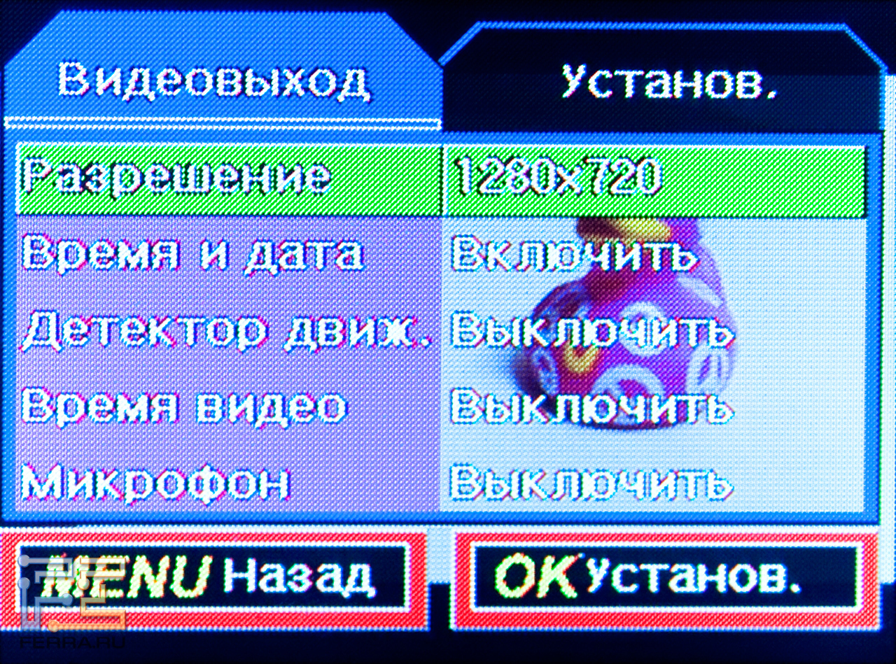 Прошивка позволяет выбрать качество видео, длину роликов (от 1 до 5 минут или без дробления), отформатировать флэшку и активировать детектор движения. Функциональность привычная, но без приятных неожиданностей. Как у всех.