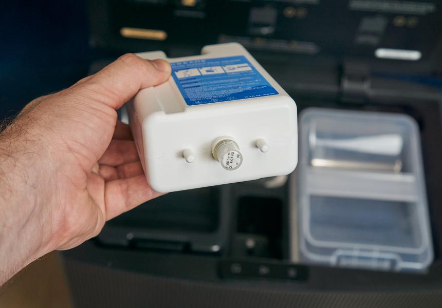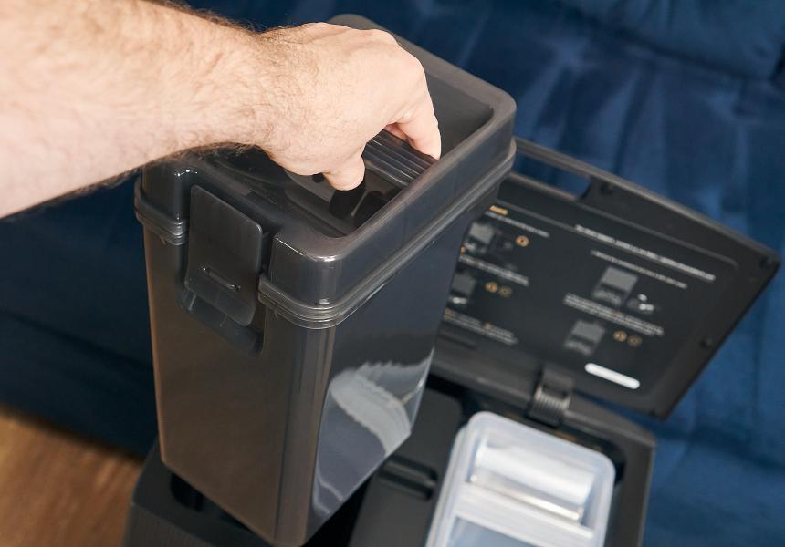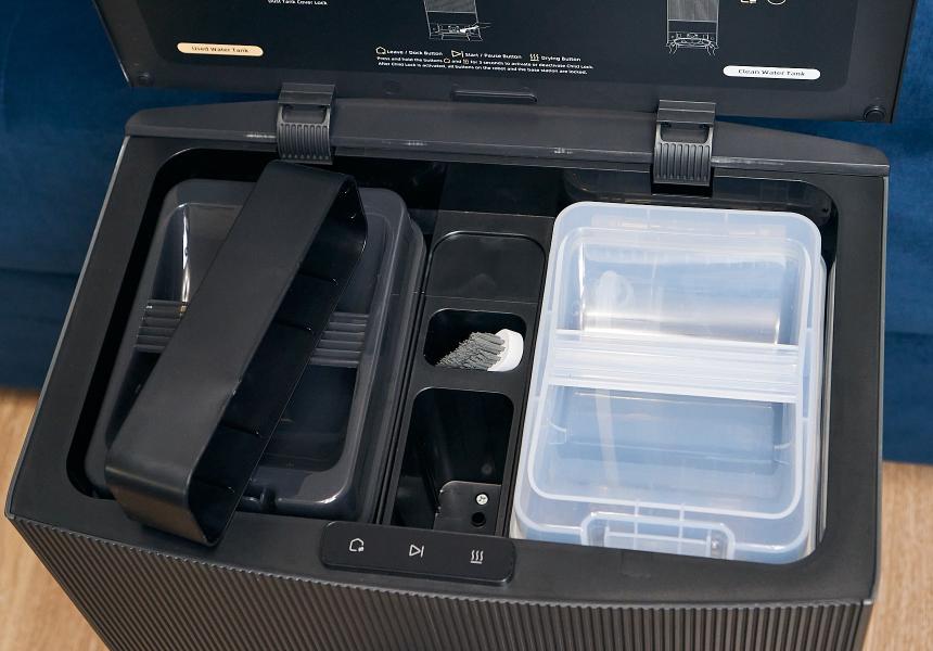 Но это не главное преимущество увеличенных габаритов базы. В отсеке с баками для воды теперь появился средний резервуар — для чистящего средства. Просто ставим туда банку с чистящим средством — и забываем про него. Пусть робот сам добавляет средство по мере уборки.