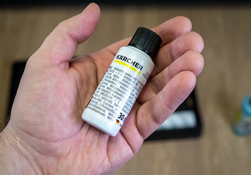 Ну и последнее — наливаем воду в специальную ёмкость. В воду можно добавлять моющее средство из комплекта, а можно не добавлять. Можно и специальный шампунь использовать (в комплекте есть бутылочка), но, опять же, для влажной уборки достаточно и просто обычной воды. Т.е. тратиться ли на спецсредства — дело ваше, смотря что вы хотите (нужна ли вам дезинфекция, например, или вдруг аромат какой-то желаете).