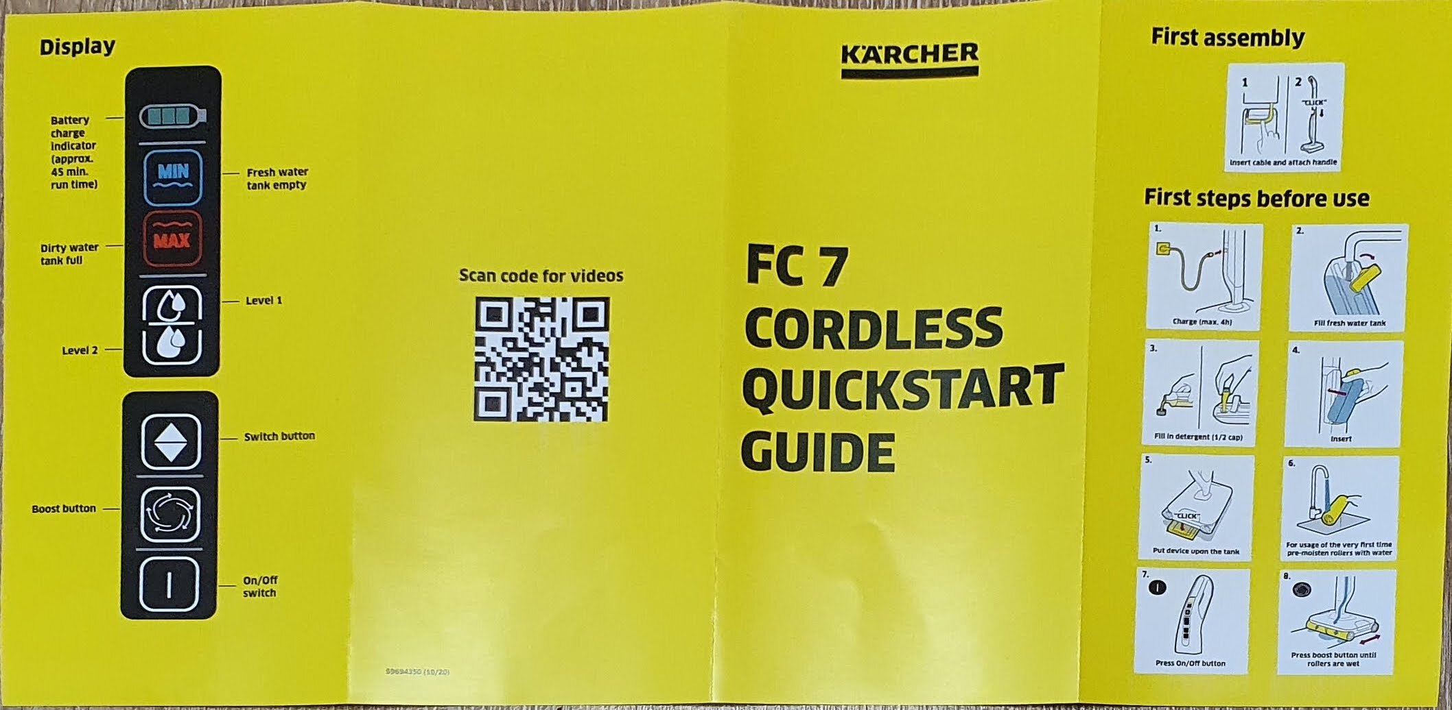Когда я распаковал Karcher FC7, то первой мыслью было — ну вот, теперь неделю со всем этим разбираться, как это работает. Но на деле разобрался я минуты за 3 — схемы в инструкции довольно точные, и даже не требуют словесного пояснения.
