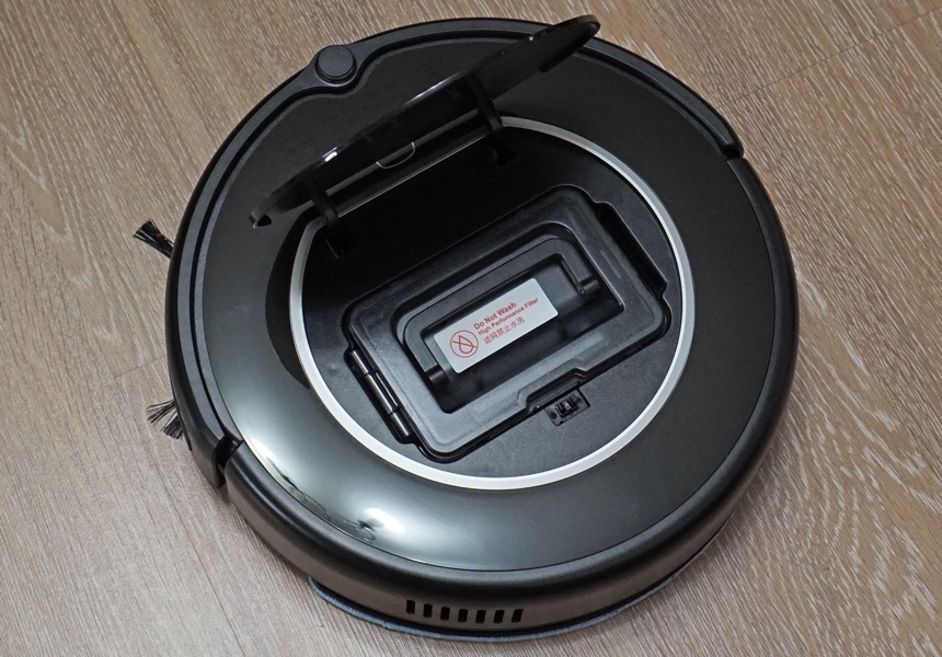 Снизу, под "тряпкой", находится ёмкость для воды (робот умеет делать влажную уборку!). Чтобы получить к ней доступ, нужно перевернуть пылесос.