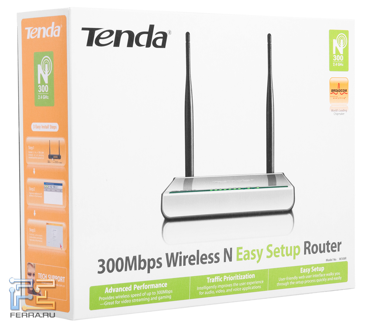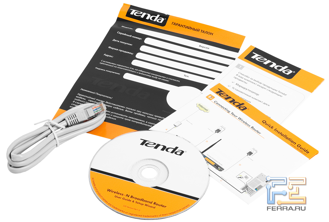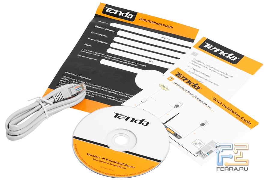 Коробка выполнена в традиционных для фирмы Tenda цветах — оранжевом, белом и зеленом. Локализация ограничена русскоязычной наклейкой с характеристиками роутеров на задней стороне коробки.