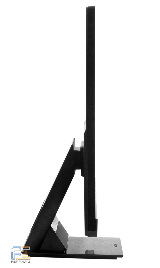 Вообще, все современные мониторы с таким дизайном очень похожи друг на друга. Нашего подопытного выделяет нога-подставка достаточно агрессивного вида. Из-за этого устройство выглядит довольно интересно, но вот возможностей по регулировке кот наплакал — можно лишь изменять наклон от -4 до +20 градусов.Мне также не очень понравилось, что на мониторе достаточно много глянца (и это притом, что вообще-то сама матрица матовая), на нем остаются отпечатки пальцев.