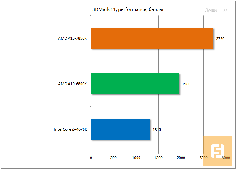 Перейдем к графическим тестам, начнем с «синтетики». Здесь ситуация кардинально меняется: Kaveri лидирует, Richland держится на втором месте, а Intel замыкает пелотон. Так, например, в 3DMark 11 A10-7850K набрал на 39% больше «попугаев», чем A10-6800K.