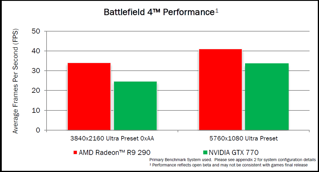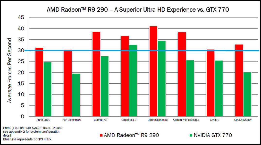 Конечно же, всю свою силушку богатырскую видеокарты AMD демонстрируют с применением сверхвысоких разрешений! Иначе зачем использовать 4 Гбайт GDDR5? На диаграммах, представленных AMD, видно, насколько (в зависимости от той или иной игры) Radeon R9 290 опережает GeForce GTX 770.