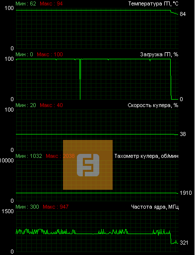 При максимальной скорости вращения турбины находится в одном помещении с тестовым стендом весьма некомфортно. Шумомер зафиксировал показатель 69 дБ. Приблизительно такой же «вой» демонстрируют современные пылесосы. Зато максимальная температура графического процессора снизилась с 95 градусов Цельсия до 65 градусов Цельсия.