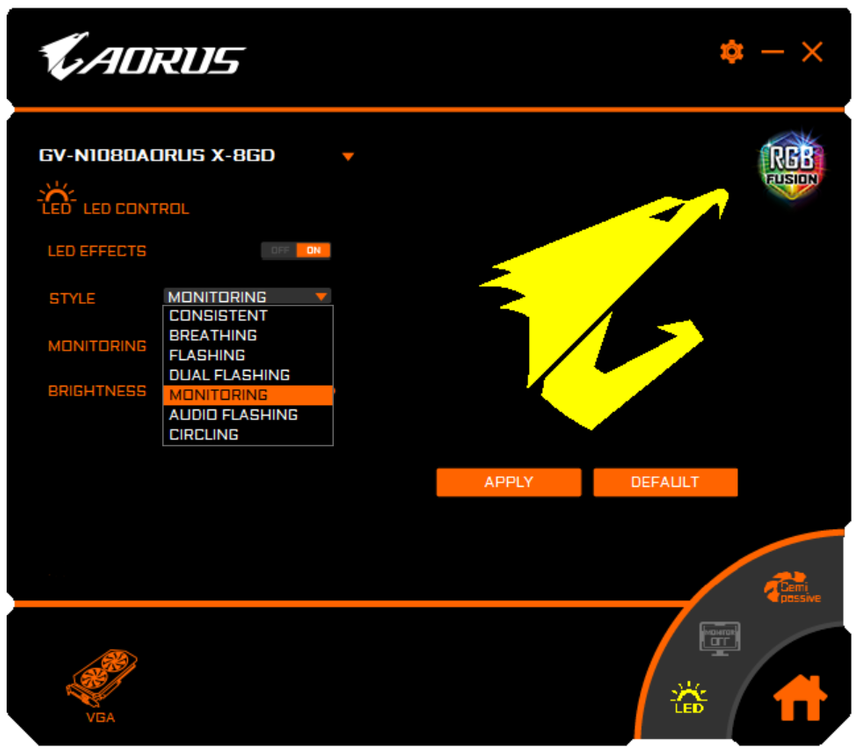 Gigabyte специально для бренда AORUS разработала небольшую программу весом всего 10 МБ. В ней выбираются режимы работы (OC, Gaming, Silent, User mode), настраивается подсветка, причем отображать можно не только температуру GPU, но и его загрузку, а также скорость вращения вентиляторов! А в последней вкладке пользователя предоставляют шанс попробовать свои силы в разгоне…