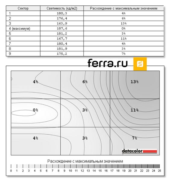 К несчастью, равномерность подсветки — не то, чем может похвастаться ASUS PA329Q. На изображении слева видно, что чем ближе к краям дисплея, тем изображение становится темнее. Разница с центром достигает внушительных 19%. В меню присутствует компенсации подобной неравномерности, результат её неважной работы можно видеть на графике справа. К тому же активация подобного режима возможна не во всех предустановленных цветовых схемах и лишает вас возможности регулировать уровень яркости, что может повлечь к очевидному дискомфорту.