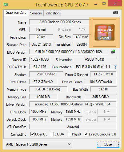 Как было сказано выше, производитель немного увеличил рабочие частоты. Устройство на заводе разогнано на 50 МГц по ядру и на 100 МГц дополнительно по памяти. Это немного, но все-таки позволяет плате получить небольшую прибавку к производительности. Нам же удалось без лишних усилий и ущерба работоспособности ROG MATRIX R9 290X PLATINUM добавить к частоте процессора еще 131 МГц. Память разогналась дополнительно на 100 МГц.