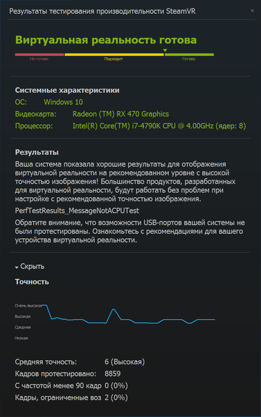 Раз есть средство по измерению быстродействия видеокарт в играх под VR, то им непременно надо воспользоваться. Как видите, Radeon RX 470 полностью подходит для подобного рода развлечений. По версии Steam, конечно же. Приятно, но по факту 99,9% владельцев «четыреста семидесятой» не приобретут себе очки виртуальной реальности.