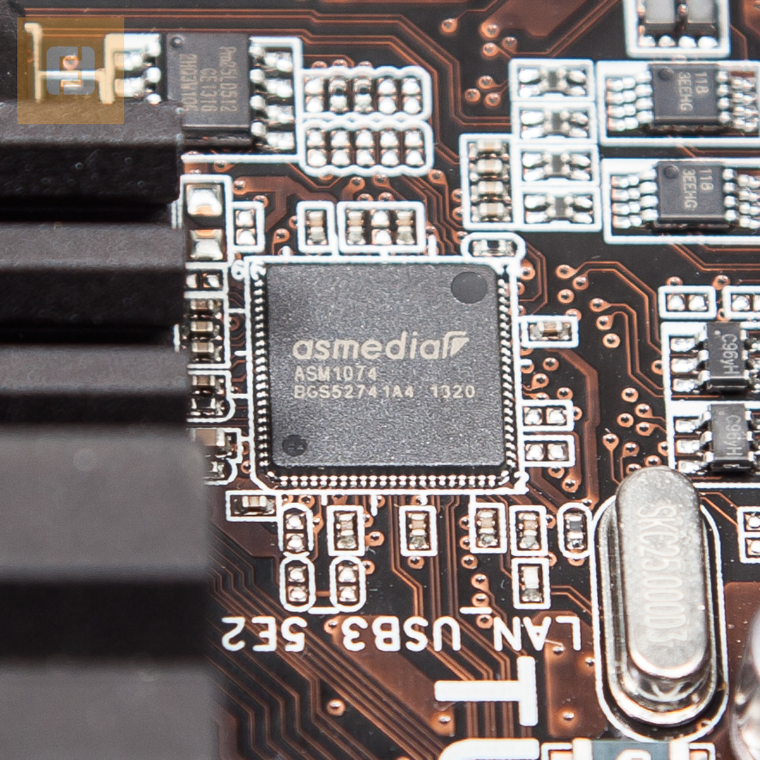 Распаянный на плате контроллер ASMedia ASM 1074 позволяет развести дополнительные порты USB 3.0. За переключение между портами ввода-вывода изображения отвечает контроллер ASMedia ASM 1442K. Благодаря распаянному контроллеру ASMedia ASM 1083 осуществляется поддержка устаревшего PCI.