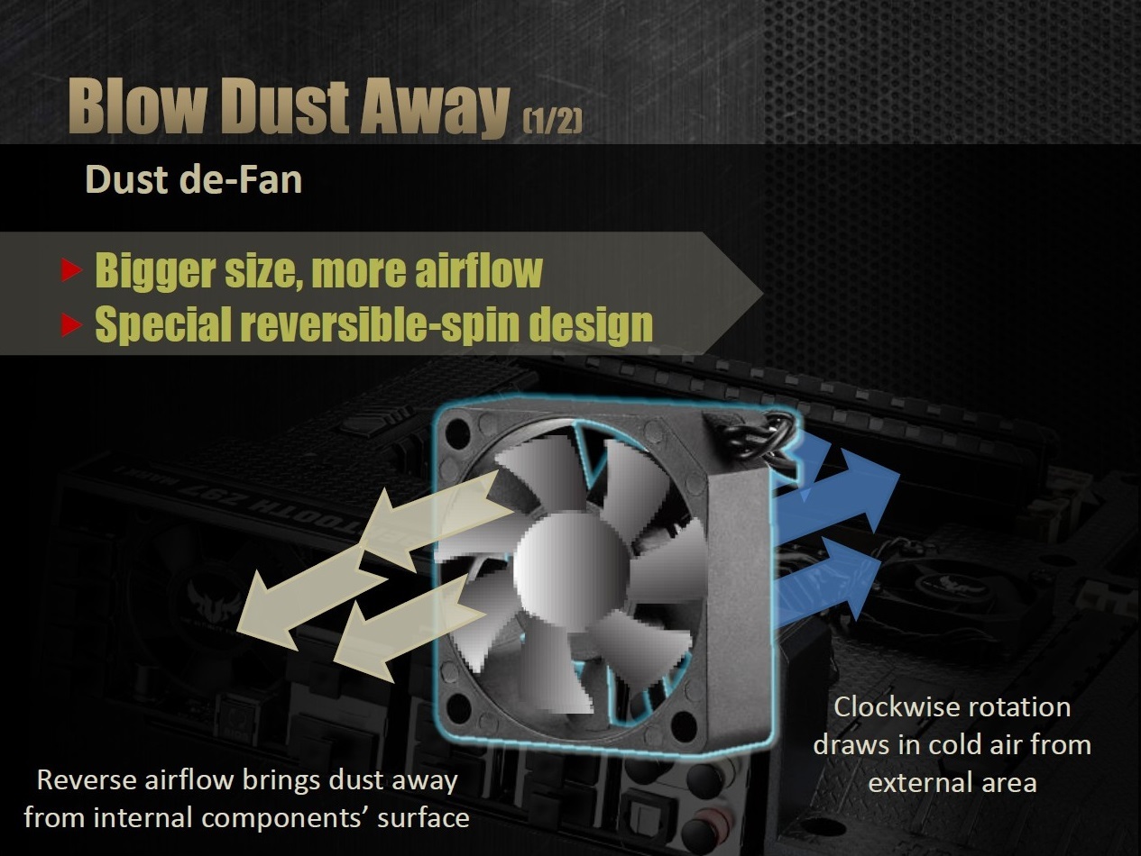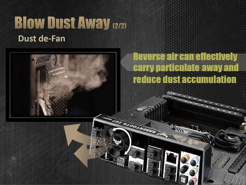 Пластиковый кожух SABERTOOTH Z97 MARK I позволяет установить на материнскую плату сразу два вентилятора, идущие в комплекте поставки. Один «карлсон» инсталлируется в специальный отсек рядом со слотами расширения. Второй ставится на I/O-панель. Технология Blow Dust Away как раз и управляет им, позволяя вентилятору работать в зависимости от ситуации как на вдув, так и на выдув.