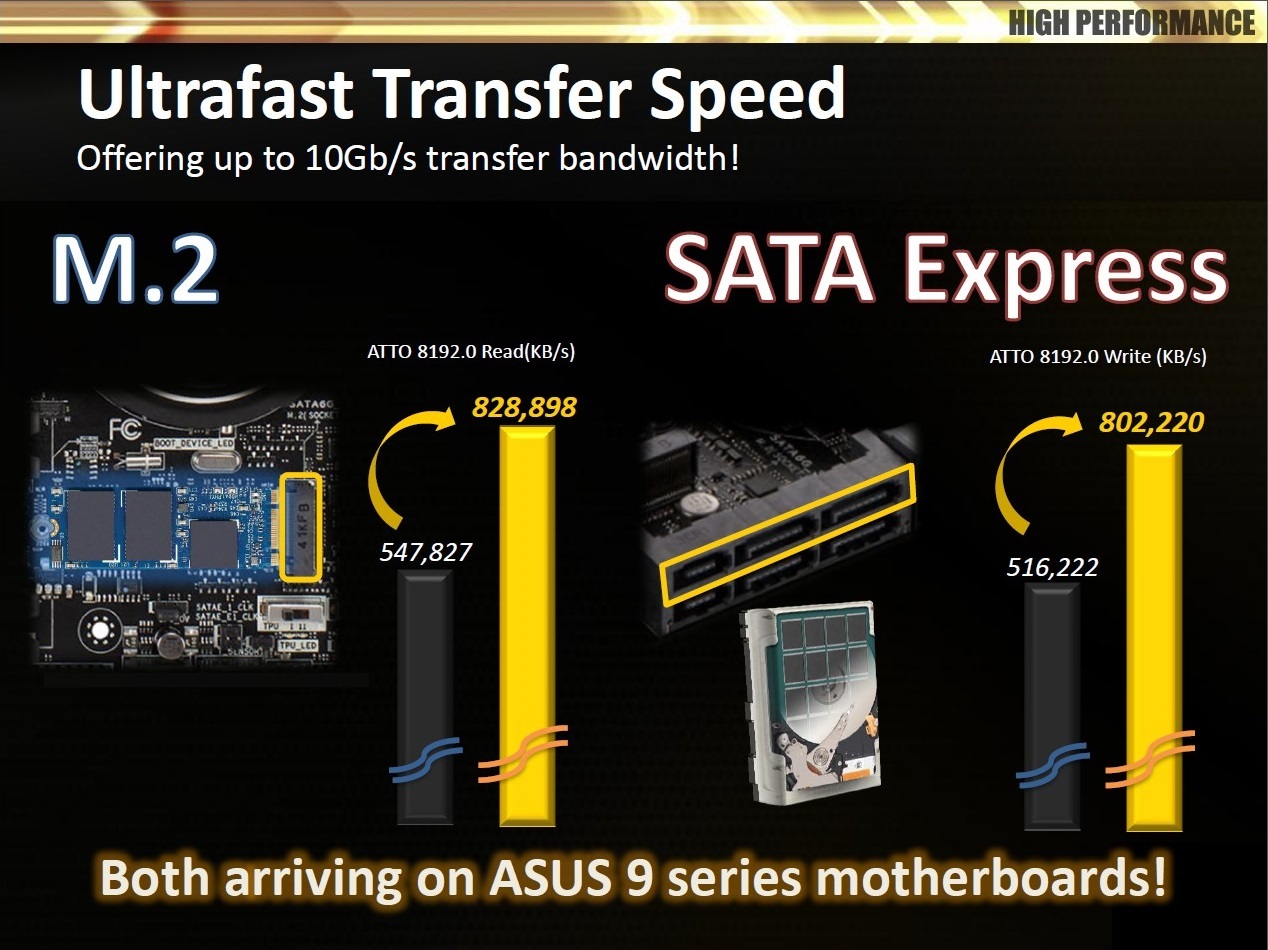 Первые накопители на базе SATA Express должны появиться в продаже летом. Также самой ASUS был выпущен специальный рэк, позволяющий объединить в один массив два твердотельных накопителя форм-фактора M2. Что-то похожее (технически) в своих решениях используют производители геймерских лэптопов.