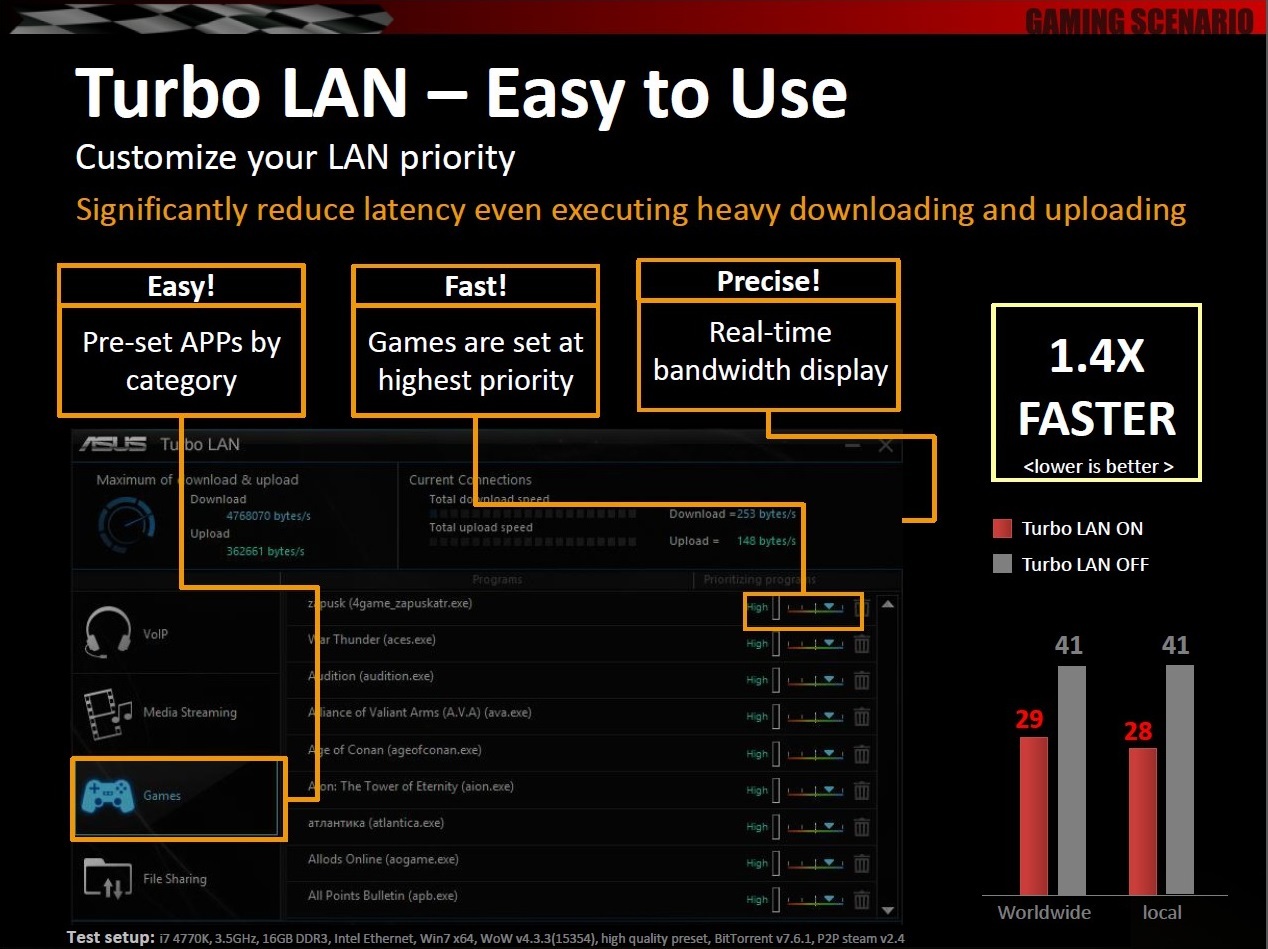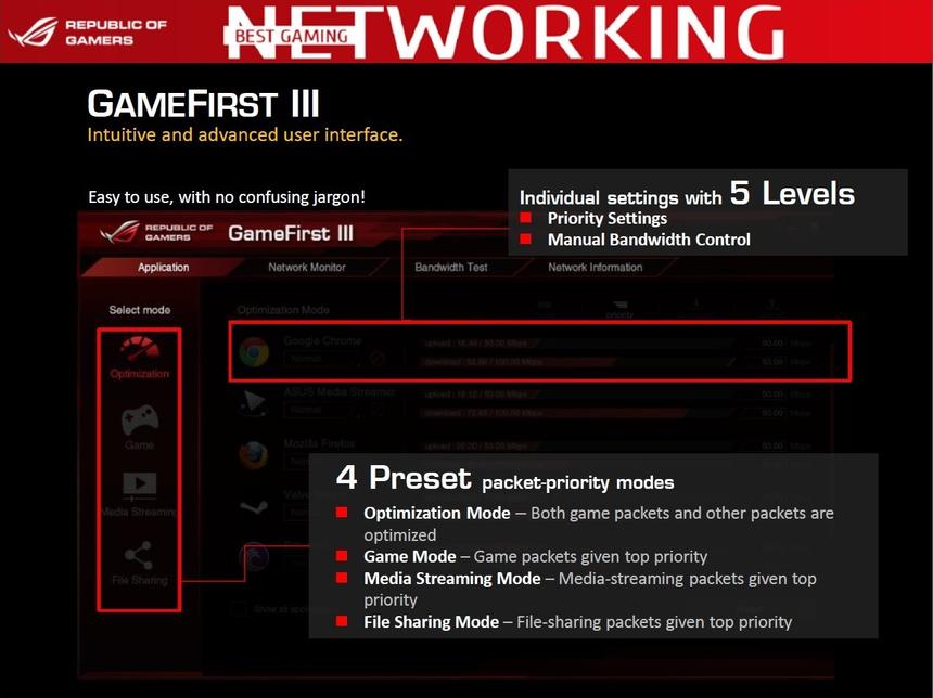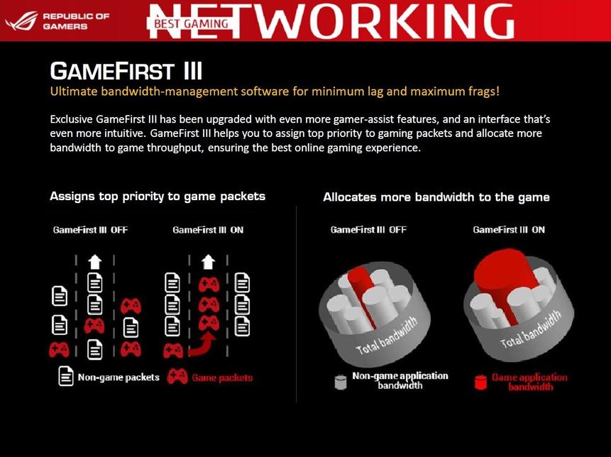 Не стоит забывать про утилиту GameFirst, о которой мы уже неоднократно писали в обзорах ROG-устройств. Одновременно с выходом материнских плат MAXIMUS VII будет доступна третья версия этой программы. С ее помощью пользователь может управлять трафиком и расставлять приоритеты для тех или иных приложений. По умолчанию GameFirst III имеет четыре запрограммированных пресета: Optimization Mode, Game Mode, Media Streaming Mode, File Sharing Mode — названия функций говорят сами за себя. К тому же утилита позволяет в режиме реального времени мониторить состояние сети и трафика, проводить тестирование сетевого окружения, а также предоставлять подробнейшую информацию обо всех настройках сети.