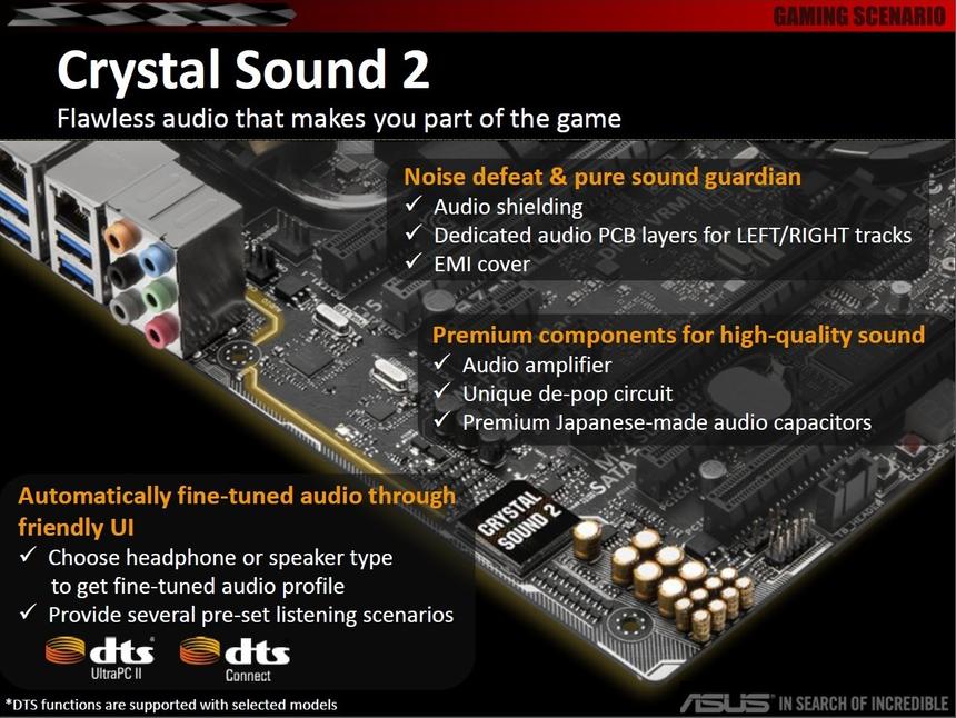 Конечно же, не стоит забывать про аудиосоставляющую материнских плат MAXIMUS VII. Интегрированный кодек обзавелся четырьмя запрограммированными модами для разных жанров компьютерных игр: FPS, Racing, Combat и Sport. Переключение между ними осуществляется либо в программном обеспечении, либо при помощи специальной клавиши, распаянной непосредственно на самой плате. Отметим, что утилита Sonic SoundStage имеет большое число настроек.