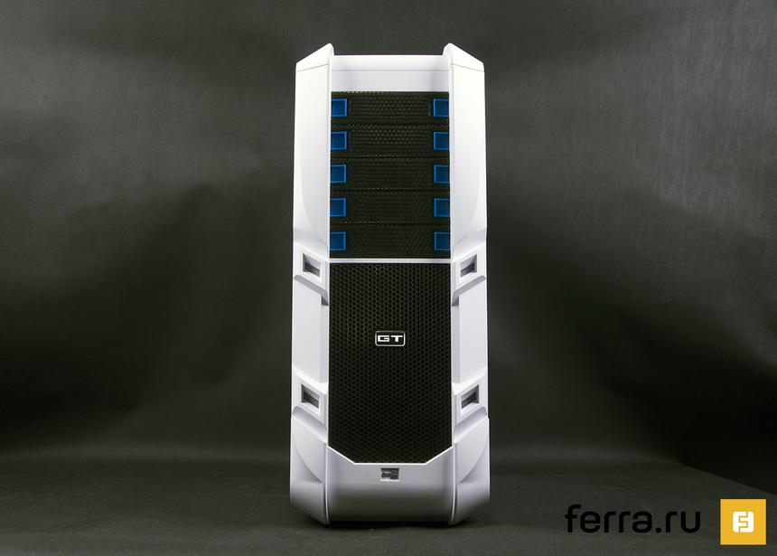 Давайте подробно рассмотрим GT-S White Edition. Передняя панель конструктивно состоит из нескольких элементов. Верхняя часть насчитывает сразу пять слотов для 5,25-дюймовых устройств. Сетчатые плашки снимают при помощи пластиковых зажимов. Легко и просто. Кстати, они оснащены пылевым фильтром. Нижняя часть играет роль воздухозаборника для установленного с внутренней стороны шасси вентилятора.
