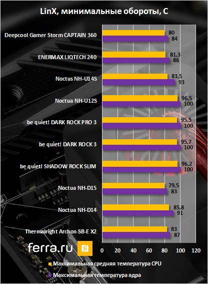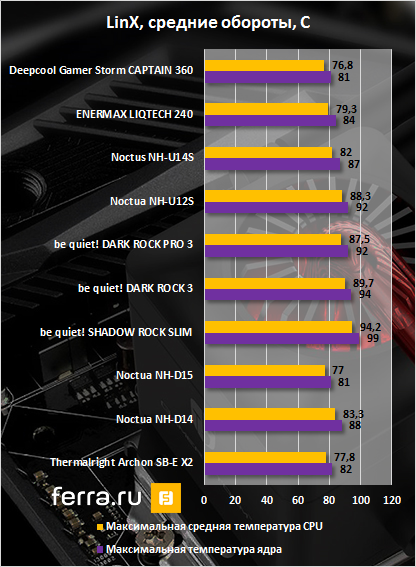 Если продолжить сравнивать работу CAPTAIN 360 с Noctua NH-D15, то окажется, что воздушный австрийский кулер работает гораздо тише. При максимальной скорости вращения вентиляторов СВО проигрывает ни много ни мало 8,5 дБ. При этом NH-D15 уже при средних и минимальных частотах функционирует практически бесшумно.