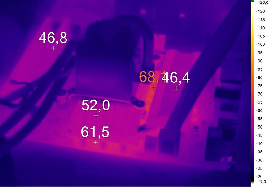 Классические воздушные кулеры (особенно Down Flow) дополнительно охлаждают и околосокетное пространство. В случае с необслуживаемыми «водянками» на это рассчитывать не приходится. Необходимо хорошее корпусное охлаждение. Так, мосфеты MSI Z97 MPOWER прогрелись до 71 градуса Цельсия.