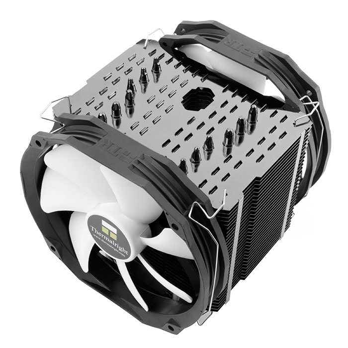 Конструкция Macho Black представляет собой медное основание, через которое проходит 6 теплотрубок, на которые, в свою очередь, насажена 31 металлическая пластина. По всей площади пластин имеется перфорация для лучшего теплоотвода, а также сквозное отверстие для доступа к крепежу кулера. Три трубки проведены вертикально, еще три изогнуты в сторону. Подобная конструкция смещает весь радиатор с вентиляторами относительно основания, что позволяет устанавливать эту огромную башню в узкое пространство на материнской плате между подсистемой питания процессора и слотами DIMM.