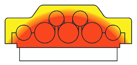 С верхней стороны основания трубки закрыты металлической площадкой, к которой крепится прижимная рамка кулера. Несмотря на естественную неровность подошвы радиатора, состоящую из отполированных тепловых трубок, отпечаток получился достаточно равномерным.