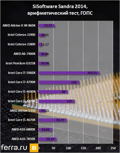 Сама AMD главным конкурентом для Athlon X4 860K считает двухъядерный процессор Intel Pentium G3258. Он тоже оснащен разблокированным множителем и обладает очень высокой тактовой частотой. Ниже приведен график с результатами, полученными самой компанией. К сожалению, таким процессорам, как Athlon X4 860K, не под силу тягаться с современными четырехъядерными моделями Intel Core i5.